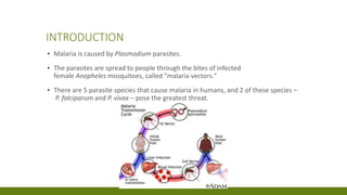 Malaria is caused by Plasmodium parasites transmitted through mosquito bites. It remains a major public health problem, with over 200 million cases and 400,000 deaths annually. Young children and pregnant women are most vulnerable. Prevention focuses on insecticide-treated bed nets, indoor residual spraying, antimalarial drugs, and surveillance. The Global Technical Strategy aims to reduce cases and deaths by 90% by 2030. National initiatives like Roll Back Malaria and High Burden High Impact work to eliminate malaria. Nepal aims to be malaria-free by 2025 through prevention, diagnosis and treatment programs.