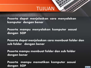 Dokumen ini membahas cara mengoperasikan komputer dasar seperti menyalakan, mematikan, dan membuat folder komputer sesuai standar operasional prosedur. Peserta akan belajar mengenali komponen-komponen dasar komputer dan cara menggunakannya dengan benar dan aman.