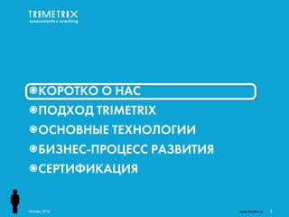 Компания Trimetrix Solutions, основанная в 2002 году, специализируется на HR-технологиях и предлагает инструменты для оценки и развития персонала, основанные на более чем 40 языках и используемые в 90 странах. Основные услуги включают сертификацию тренеров и коучей, долгосрочные программы развития сотрудников и развитие отделов продаж. Система Trimetrix позволяет глубже понять внутренние таланты сотрудников и подобрать индивидуальные модели их развития.