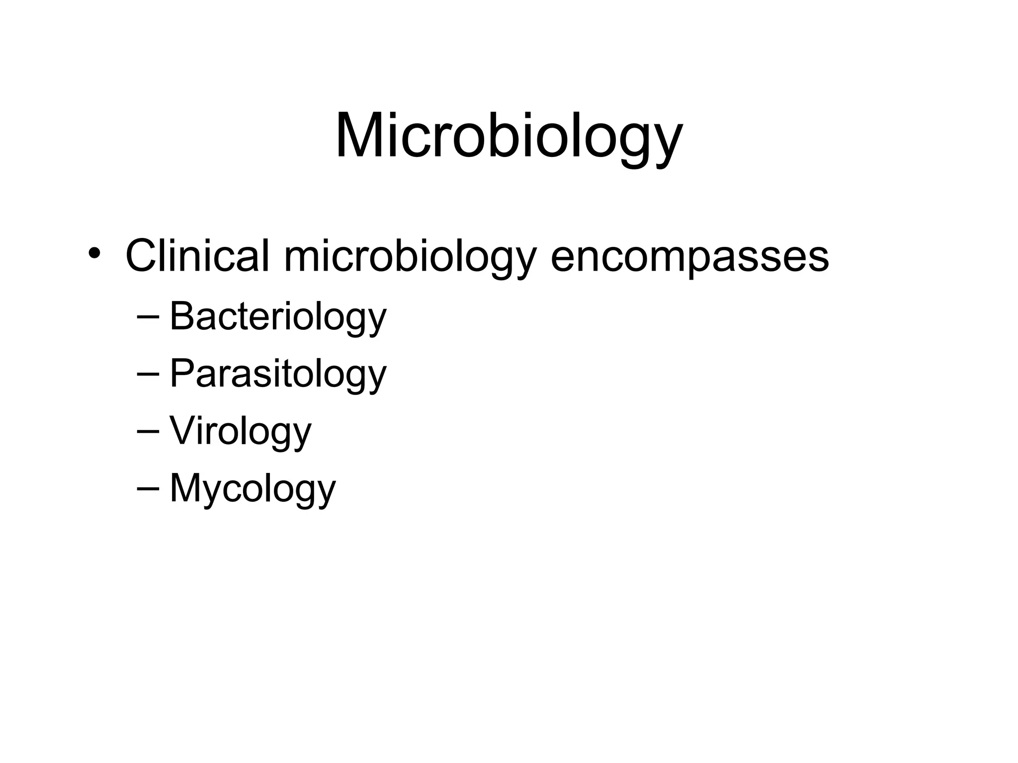 Microbiology encompasses the study of bacteria, parasites, viruses, and fungi. Bacteriology includes identifying bacterial characteristics, appropriate specimen collection, aseptic technique, culture techniques, colony characteristics, gram staining, and common bacterial infections like bacteremia, meningitis, and those caused by Staphylococcus, Streptococcus, Enterococcus, Candida, Cryptococcus, and E. coli. Identification requires observing bacterial growth, morphology, hemolysis, gram reaction, and automated methods.