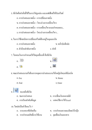 กต์ให้กบสไลด์ ่ ก. การนาเสนอภาพนิ่ง > การเปลี่ยนภาพนิ่ง ข. การนาเสนอภาพนิ่ง > โครงร่ างการเคลื่อนไหว ค. การนาเสนอภาพนิ่ง > การเคลื่อนไหวแบบกาหนดเอง... ง. การนาเสนอภาพนิ่ง > โครงร่ างการเคลื่อนไหว... ้ ่ 6. ในการใช้เทคนิคการเปลี่ยนสไลด์ตองอยูในมุมมองใด ก. การนาเสนอภาพนิ่ง ข. หน้าบันทึกย่อ ค. ตัวเรี ยงลาดับภาพนิ่ง ง. ปกติ 7. ไอคอนในการกาหนดให้วตถุเคลื่อนที่ คือข้อใด ั ก. ข. ค. ง. 8. ขณะนาเสนองานถ้าต้องการหยุดการนาเสนองานให้กดปุ่ มใดบนคียบอร์ด ์ ก. Esc ข. Home ค. End ง. Enter 9. หมายถึงข้อใด ก. ชมการนาเสนอ ข. การเชื่อมโยงหลายมิติ ค. การเรี ยงลาดับข้อมูล ง. แสดงวิธีการใช้ Excel 10. ไฮเปอร์ลิงค์ คืออะไร ? ก. การแทรกข้อคิดเห็น ข. การกาหนดรายละเอียดเวิร์กบุ๊ก ค. การกาหนดสิ ทธิ์การใช้งาน ง. จุดเชื่อมโยงเอกสาร