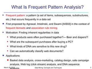 The document discusses frequent pattern mining and the Apriori algorithm. It introduces frequent patterns as frequently occurring sets of items in transaction data. The Apriori algorithm is described as a seminal method for mining frequent itemsets via multiple passes over the data, generating candidate itemsets and pruning those that are not frequent. Challenges with Apriori include multiple database scans and large number of candidate sets generated.