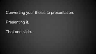 The document provides suggestions for creating a single slide summary of a thesis presentation. It recommends including the key elements of the research, results, and relevant images on the one slide. Alternatively, a quote that encapsulates the thesis could be used. The document humorously advises against making the font too small to fit everything or relying on clipart without offering proper tribute to the Gods of Clipart.