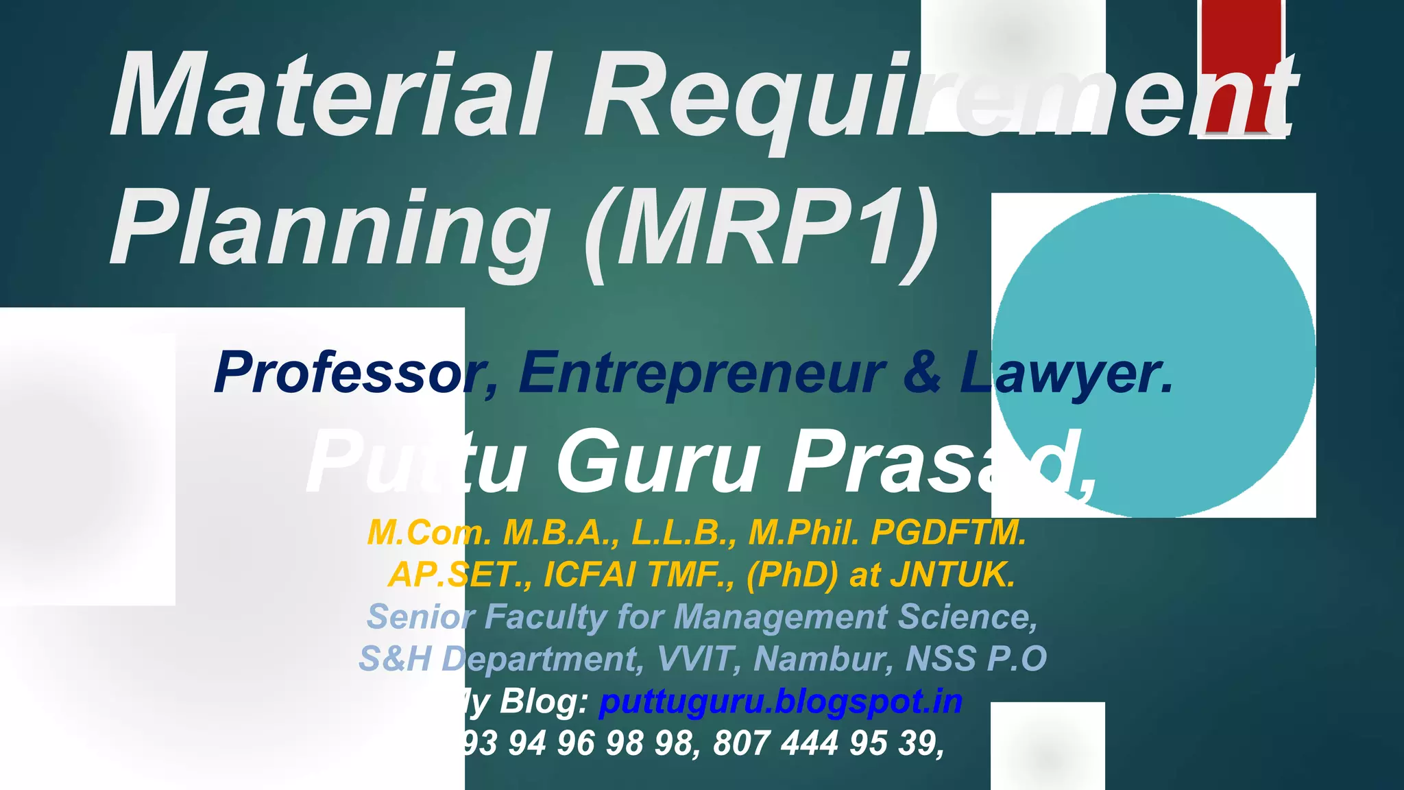 Material Requirement Planning (MRP) is a computerized inventory control and production planning system that helps manage and schedule manufacturing components based on order priorities and available capacities. It effectively reduces inventory levels, component shortages, and lead times while improving customer service and plant efficiency. The MRP process involves identifying requirements, running MRP to create suggestions, and firming those suggestions into manufacturing and purchasing orders.