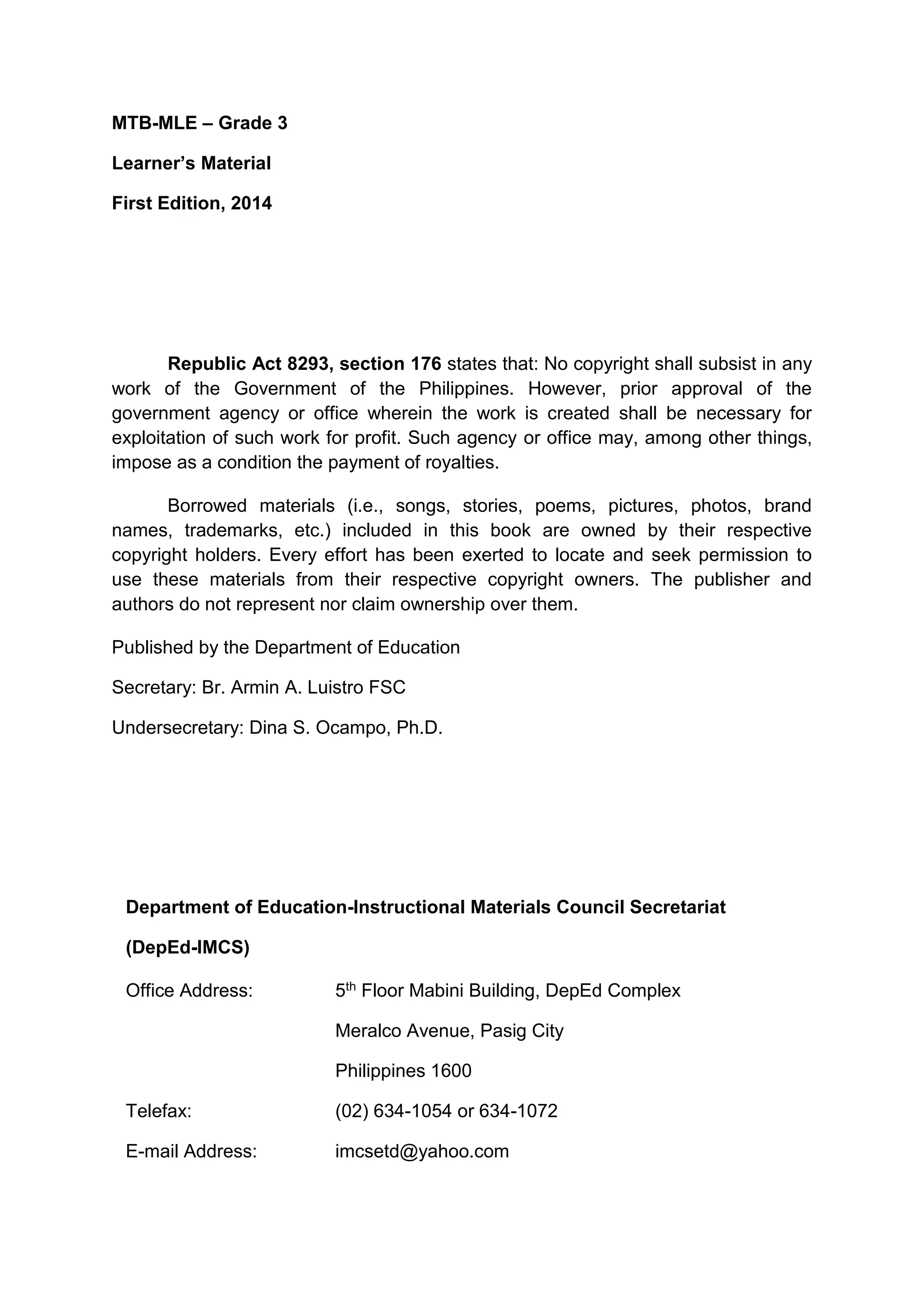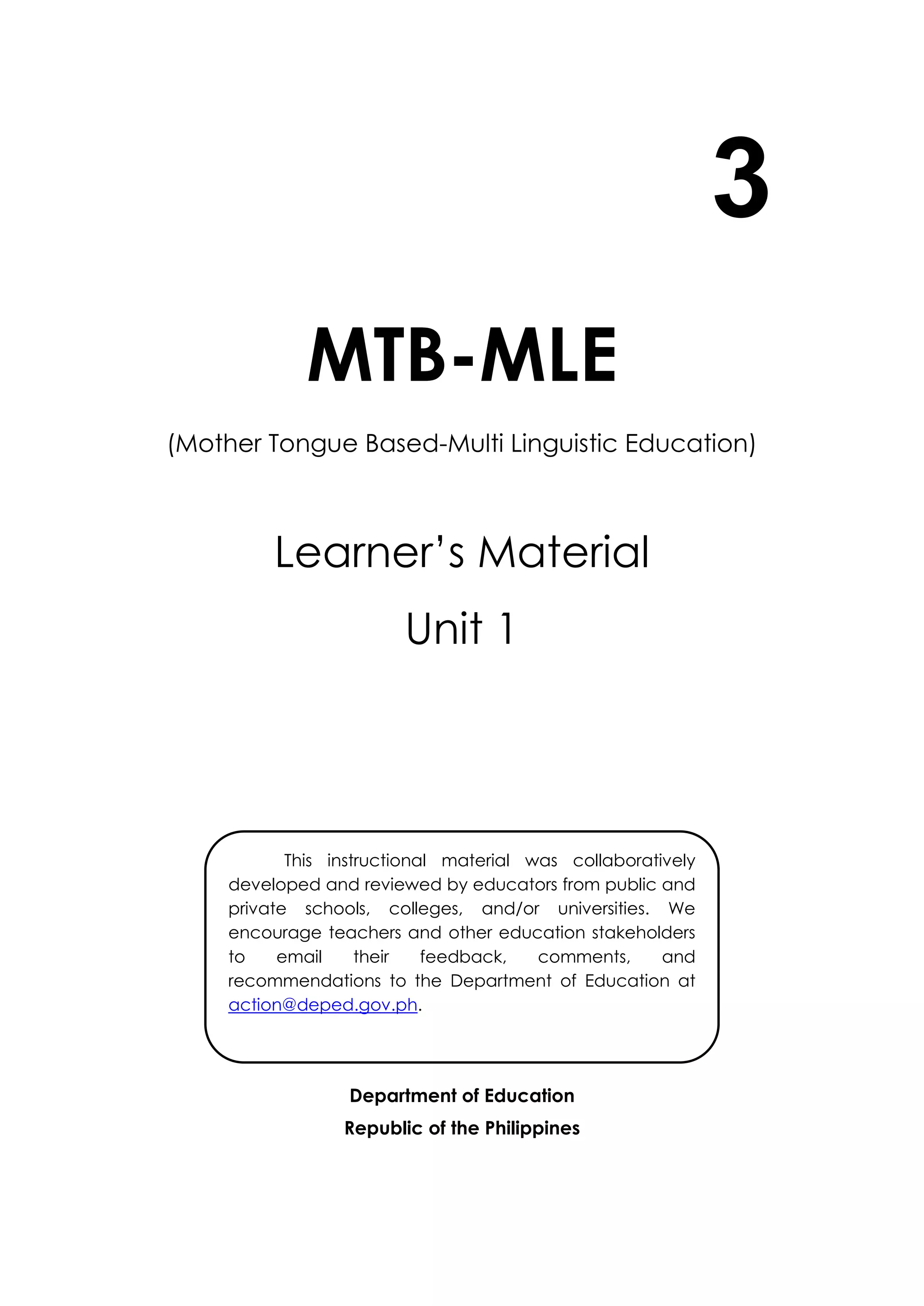 This document is a table of contents for an instructional material on Mother Tongue Based Multi-Linguistic Education (MTB-MLE) for grade 3 students. It outlines the weekly activities and assessments that make up the curriculum. The material was collaboratively developed by educators in the Philippines and its copyright is held by the Department of Education of the Republic of the Philippines.