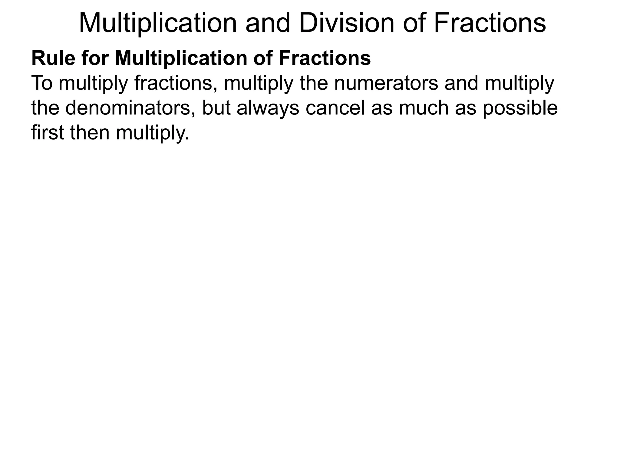 The document discusses multiplication and division of fractions. It states that to multiply fractions, one should multiply the numerators and multiply the denominators, cancelling terms when possible. Some examples are provided, such as multiplying 12/15 by 25/8, which equals 3/5. The document also discusses how phrases like "x fraction of y" can be translated into fractional multiplications.