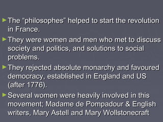 The philosophes were groups of thinkers in 18th century France who met to discuss social and political issues and solutions to social problems. They rejected the ideas of absolute monarchy and favored democracy. Some of the most influential philosophes included Voltaire, Montesquieu, and Rousseau. They believed that reason and science should guide society rather than religion or tradition. Their ideas helped spark the French Revolution by challenging the status quo and authority of the monarchy and church.