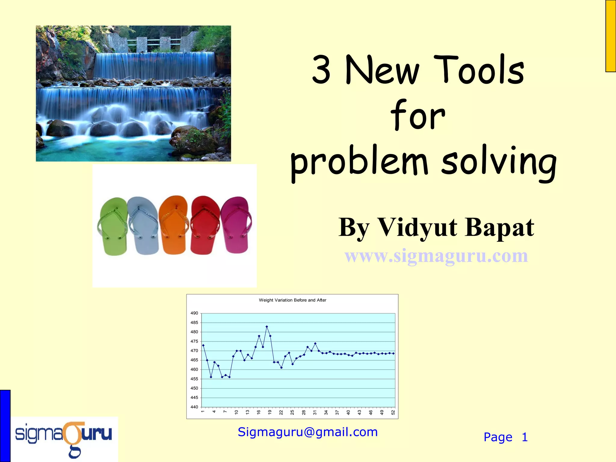 The document presents three new problem-solving tools developed by Sigmaguru: trace diagram, surrogate parameter, and DAM (data to money). Each tool is accompanied by case studies demonstrating their effectiveness in reducing product rejection rates to zero. These methods provide graphical representations and substitute parameters that help organizations identify and eliminate root causes of defects in their production processes.