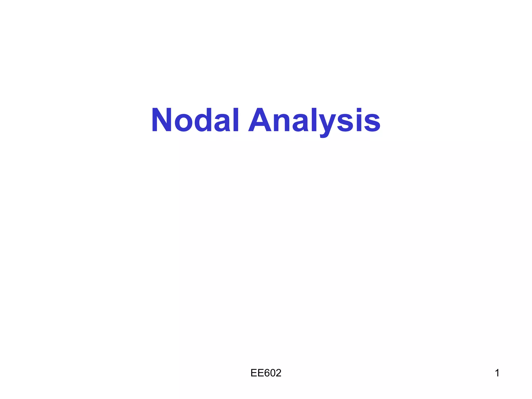 The document discusses the steps of nodal analysis which includes choosing a reference node, assigning voltages to nodes, applying Kirchhoff's Current Law (KCL) at each node to obtain equations relating currents and voltages, and solving the system of equations to determine node voltages. An example circuit is presented and nodal analysis is performed on it by defining node voltages, writing KCL equations, and solving to find the output voltage. Nodal analysis is a technique for analyzing electrical circuits by writing equations at nodes based on KCL.