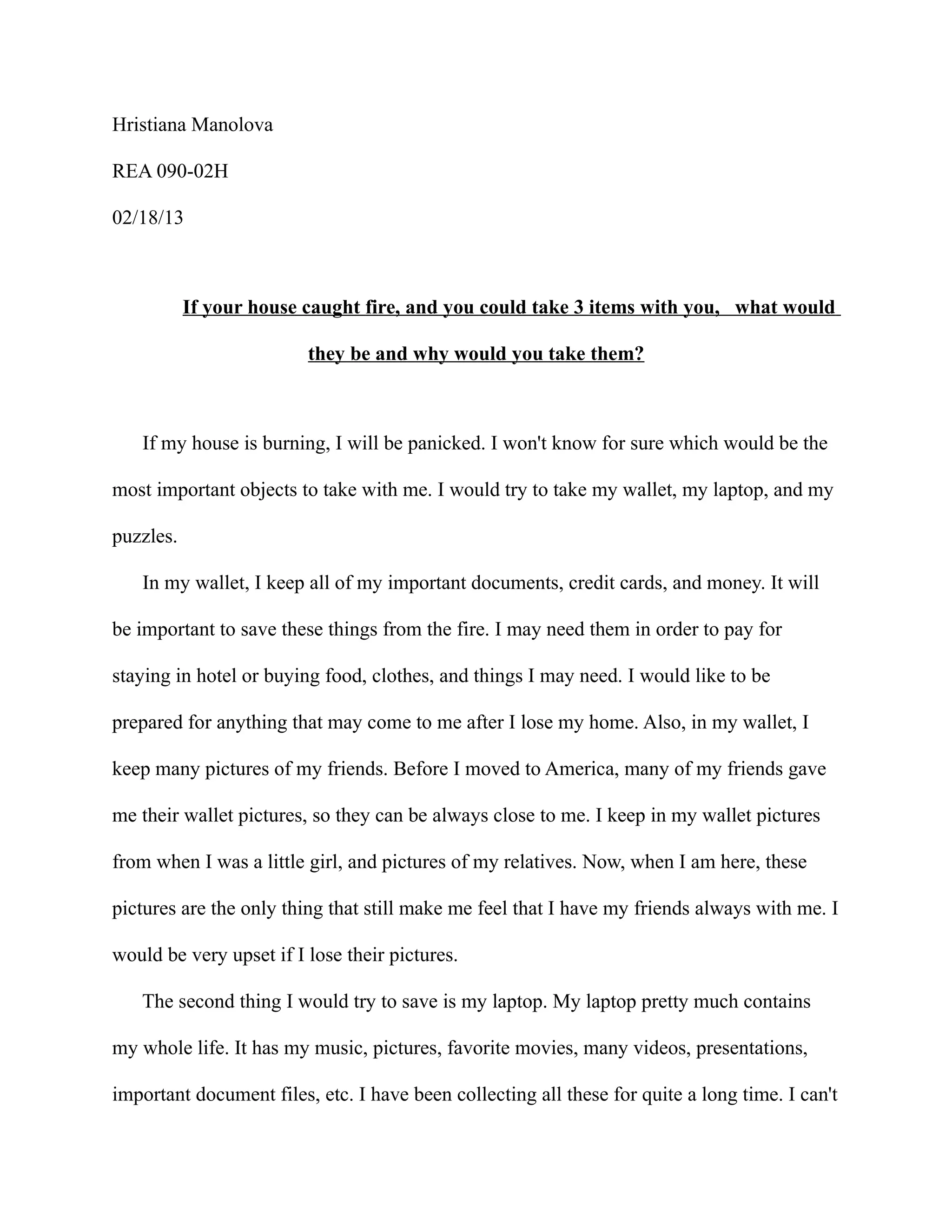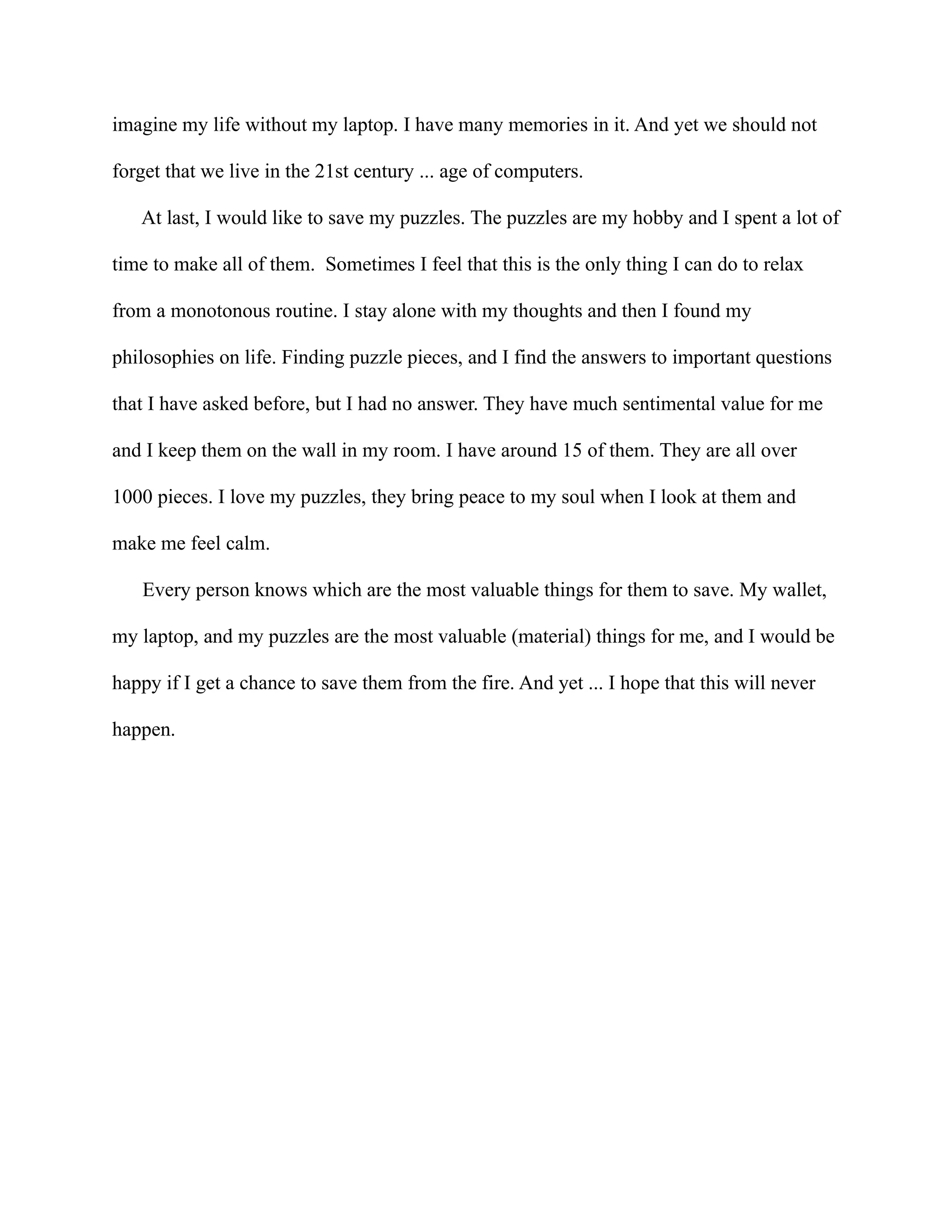 If her house caught fire, the author would try to save her wallet, laptop, and puzzles. Her wallet contains important documents, pictures, and money that would help replace what was lost. Her laptop has all of her personal files, memories, music and movies from her life. Her puzzles are a treasured hobby that help her relax and bring her joy. While panicked in an emergency, these three items contain the most important information and memories for the author.