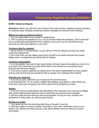 The document provides strategies for overcoming common negative success indicators for students. For making excuses and blaming others, the strategies are to take responsibility for your own work and not blame others. For tardiness, the strategies are to arrive to class 15 minutes early and get enough sleep so you aren't tired. For avoiding responsibility, the strategies are to realize you need to do your own work to learn and split group assignments evenly. For partying over studying, the strategies are to finish homework before socializing and prioritize school over parties. For apathy, the strategies are to stop attending class if uninterested or set goals and be excited about your studies. For lack of focus or goals, the strategies