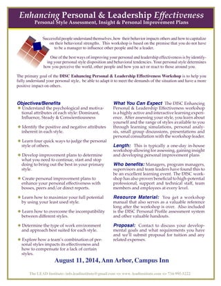 This document describes a workshop called "Enhancing Personal & Leadership Effectiveness" hosted by The LEAD Institute. The workshop aims to help participants understand their personal leadership style, how it impacts others, and how to adapt it effectively. It uses the DISC assessment tool to provide insights into participants' psychological attributes and development areas. The one-day workshop involves learning simulations, discussions, and personalized consultation to help participants maximize their strengths and potential.