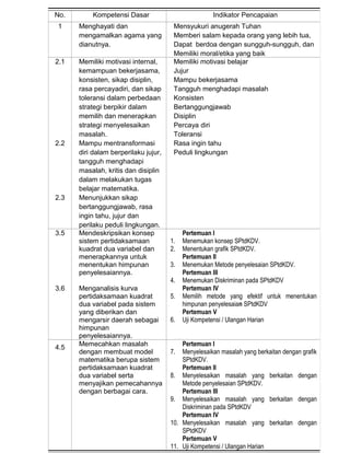 Dokumen ini adalah rencana pelaksanaan pembelajaran matematika di SMA Negeri 9 Kabupaten Tebo untuk kelas X, fokus pada materi persamaan linear dan kuadrat serta fungsi eksponen dan logaritma. Rencana ini mencakup kompetensi inti dan dasar, tujuan pembelajaran, serta strategi dan langkah-langkah pembelajaran selama lima pertemuan. Konsep yang diajarkan meliputi sistem pertidaksamaan kuadrat dua variabel, metode penyelesaian, dan aplikasi praktis dalam kehidupan sehari-hari.