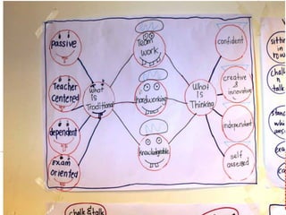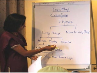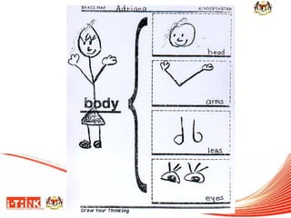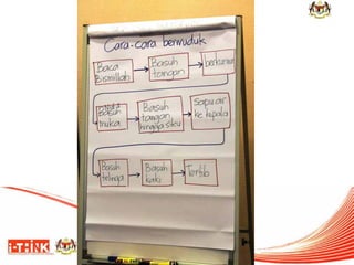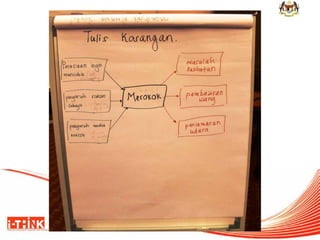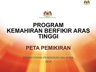 Dokumen ini membahas program kemahiran berfikir aras tinggi yang diperkenalkan oleh Kementerian Pendidikan Malaysia, yang menggunakan peta pemikiran sebagai alat untuk mendorong pemikiran reflektif dan kolaborasi di kalangan pelajar. Peta pemikiran ini mengintegrasikan proses kognitif dalam pembelajaran dan berfungsi sebagai kaedah visual untuk membantu pelajar memahami konsep yang kompleks. Pelaksanaan peta pemikiran di sekolah diharapkan dapat menyediakan cara berfikir yang konsisten dan 'brain compatible' bagi guru dan murid.