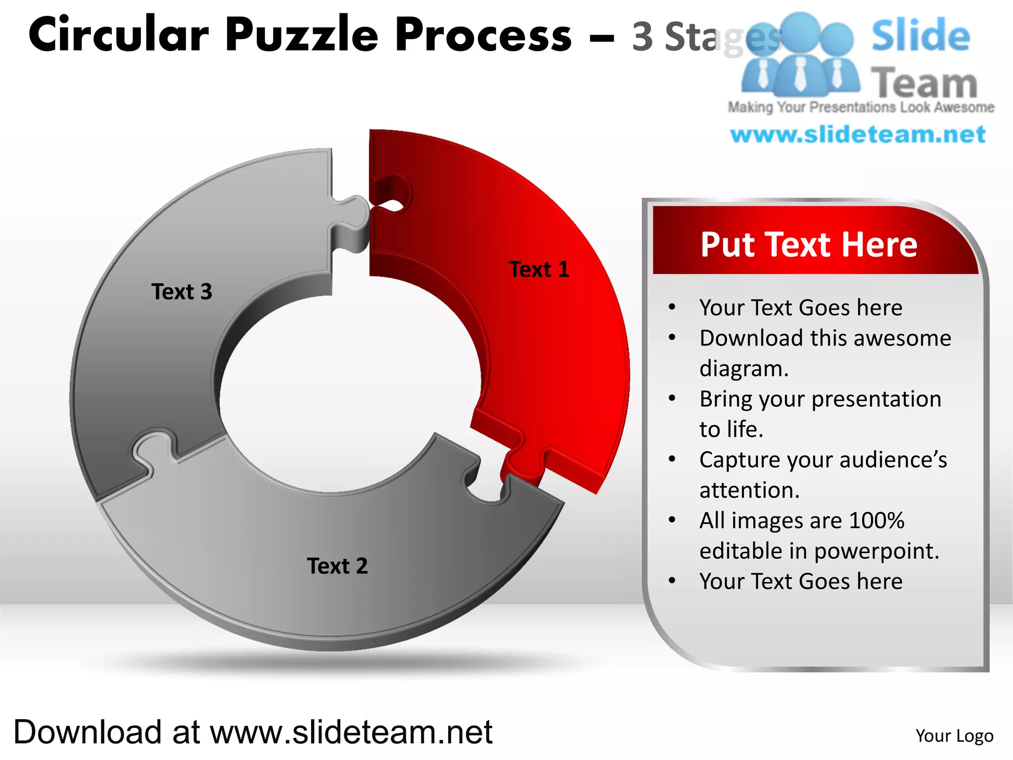The document describes a circular puzzle process with 3 stages. It promotes an awesome diagram that can be downloaded from www.slideteam.net. The diagram allows users to bring presentations to life by capturing audiences' attention with 100% editable images in PowerPoint.