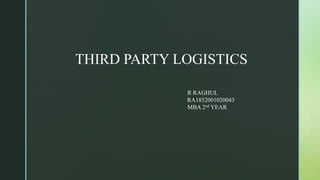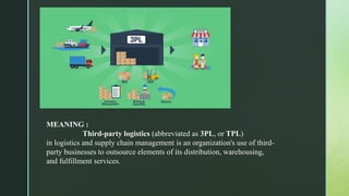 Third-party logistics (3PL) involves outsourcing elements of distribution, warehousing, and fulfillment services to specialized third-party businesses. 3PL providers offer integrated operations and customized solutions to meet customer demands. As of 2014, 80% of Fortune 500 companies used some form of 3PL services. There are four main types of 3PL providers: standard, service developer, customer adapter, and customer developer - with customer developers integrating fully with clients. Outsourcing to 3PL provides benefits like reduced costs and capital requirements, as well as allowing companies to focus on their core business. However, it also means losing some control and ensuring IT integration with providers.