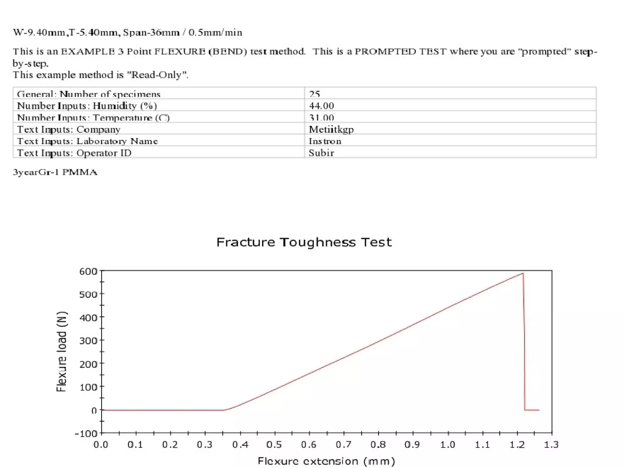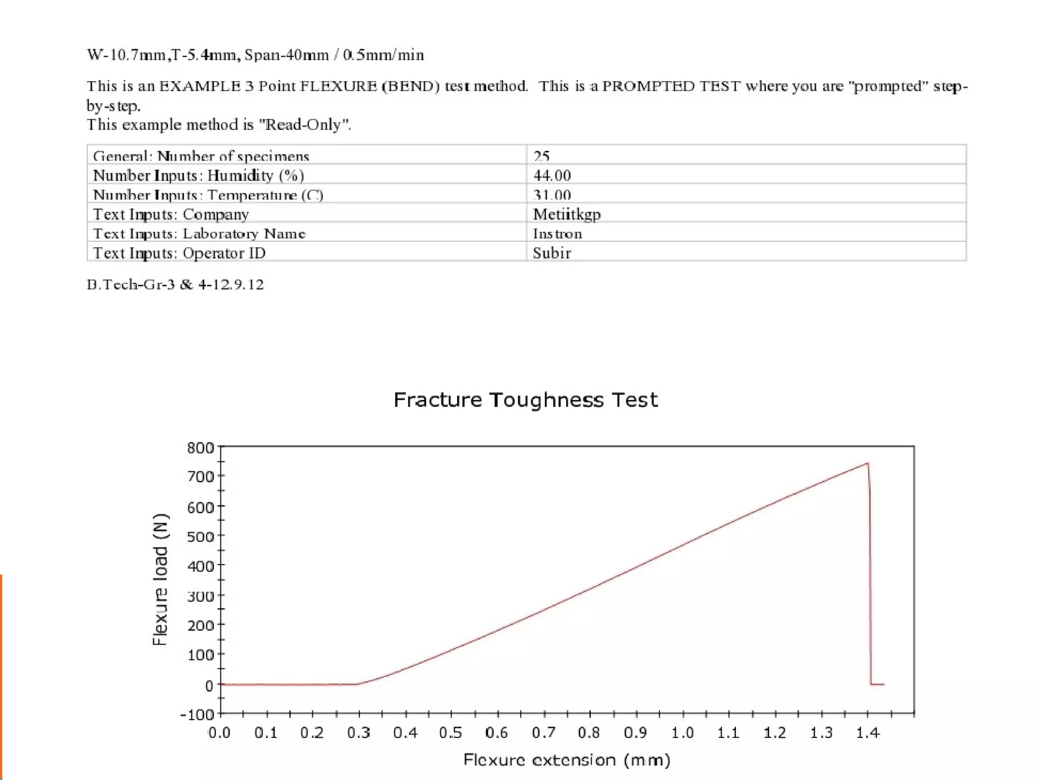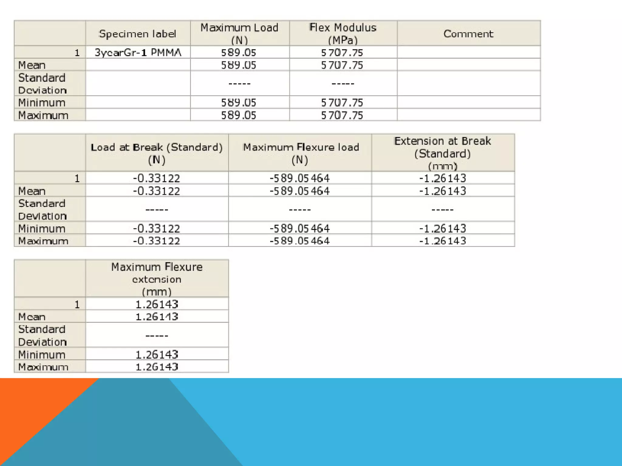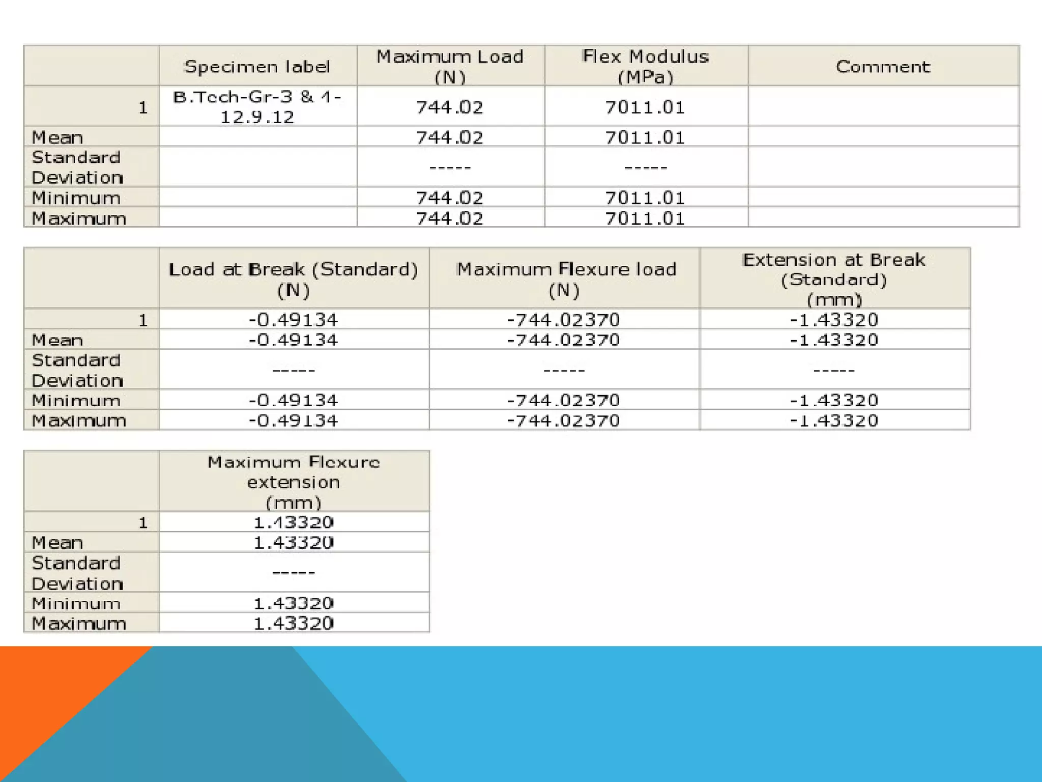 Discusses the results derived from flexural tests and includes calculations for stress, strain, and modulus.