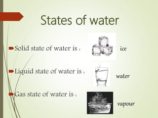 Water can exist in three states of matter: as a solid (ice), a liquid (water), or a gas (water vapor). Ice melts into water and water evaporates into vapor through boiling or evaporation; vapor condenses back into liquid water through condensation and liquid water freezes back into solid ice. The document provides examples of the three states of water and the phase changes between each state.