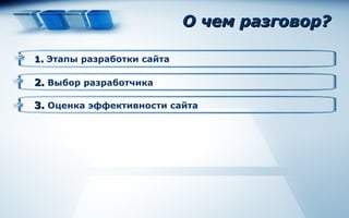 Документ подробно описывает этапы разработки веб-сайта, включая предпроектную подготовку, дизайн, верстку и тестирование, а также важность выбора разработчика. Упоминаются разные типы компаний, занимающихся веб-разработкой, и критерии для их выбора. Также освещается необходимость оценки эффективности сайта и его продвижения для достижения коммерческих целей.