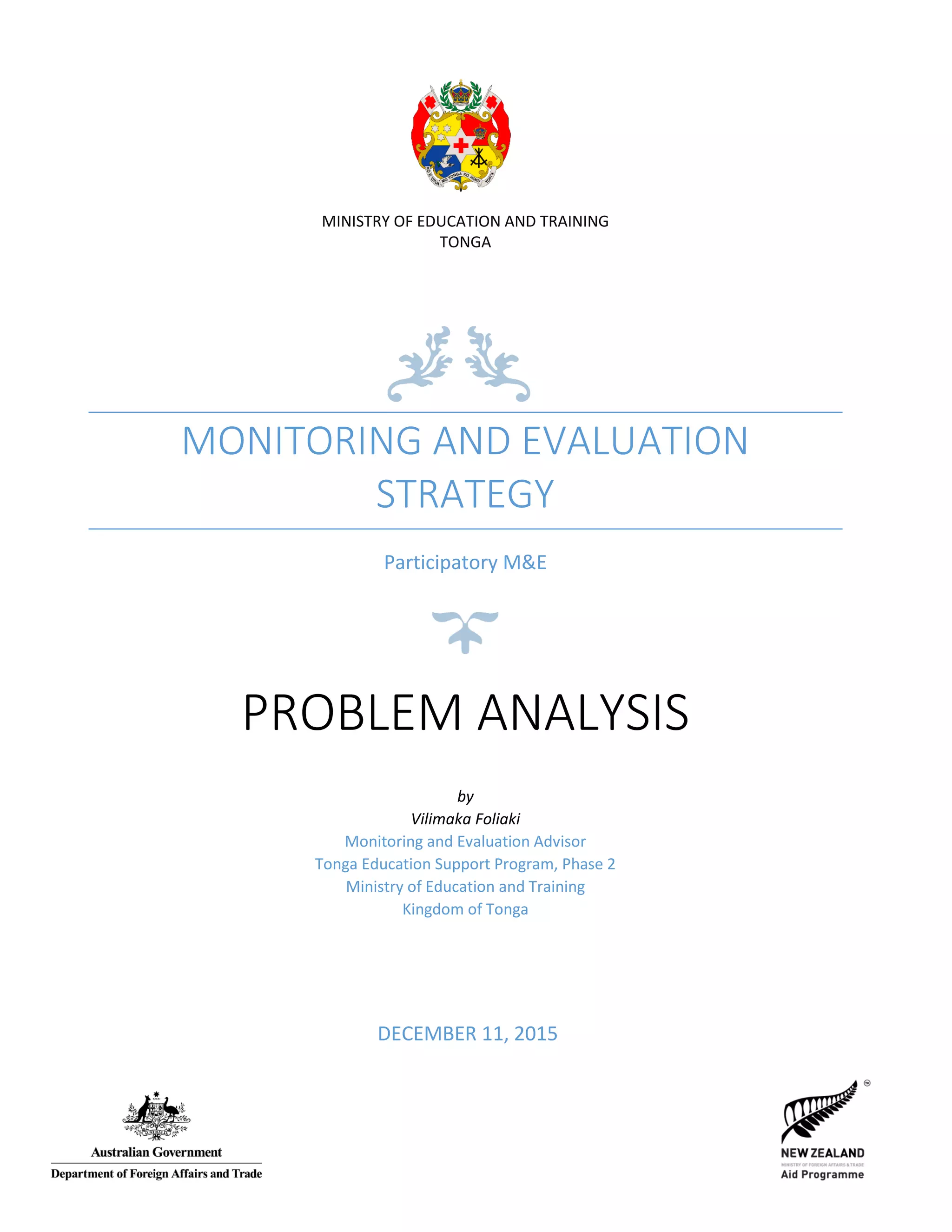This document outlines strategies for participatory monitoring and evaluation (M&E) in Tonga's education system. It discusses using problem and solution trees to thoroughly analyze issues. The problem tree identifies core problems, causes, and effects, revealing complexity requiring multiple solutions. Drawing the problem tree collaboratively helps stakeholders understand issues. The solution tree then informs goals, objectives, and interventions to address root causes. Together, these tools provide a framework for designing effective M&E processes and selecting appropriate activities, indicators, and targets to solve problems in Tonga's education system.