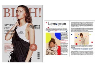 The document describes experiments with magazine layout designs. For the front cover, the author tested placing a photo of Zendaya over the title and settled on using a grey background photo. For the double page spread, grids helped with layout and a theme was added using colored dots in a photo. Pull quotes in the theme colors were also tested. In a reflection, the author notes elements they want to keep - like colors matching, titles behind models, pull quotes, varied layouts, and using guides for professionalism.