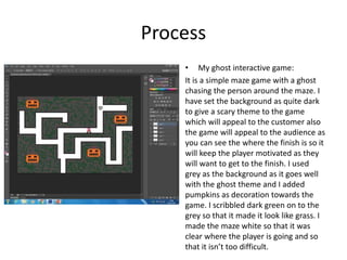 The document describes an experimental ghost maze game. The game has a dark, scary background theme with pumpkins as decorations. The maze is white to make it clear where the player can go and not too difficult. For the final product, the document says it will include the maze idea to make the game challenging and fun. It will also keep the theme of a character being chased to add tension. The final game will use frame by frame animation and be point to point to give a clear objective to motivate the player.