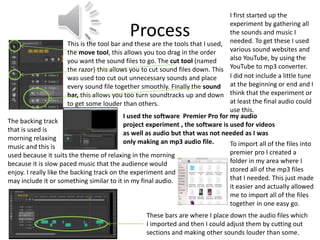 The document summarizes an audio experiment Jay Birkin conducted using Adobe Premier Pro software. He imported MP3 audio files into the software and organized them on the timeline. Jay used various tools like the cut, move, and sound level tools to edit the audio files, cutting out unnecessary sounds and adjusting levels. The backing track was morning relaxing music. For the final audio, Jay plans to include a similar backing track played quietly in the background while he talks, and will use the editing tools like cut to organize the audio smoothly.