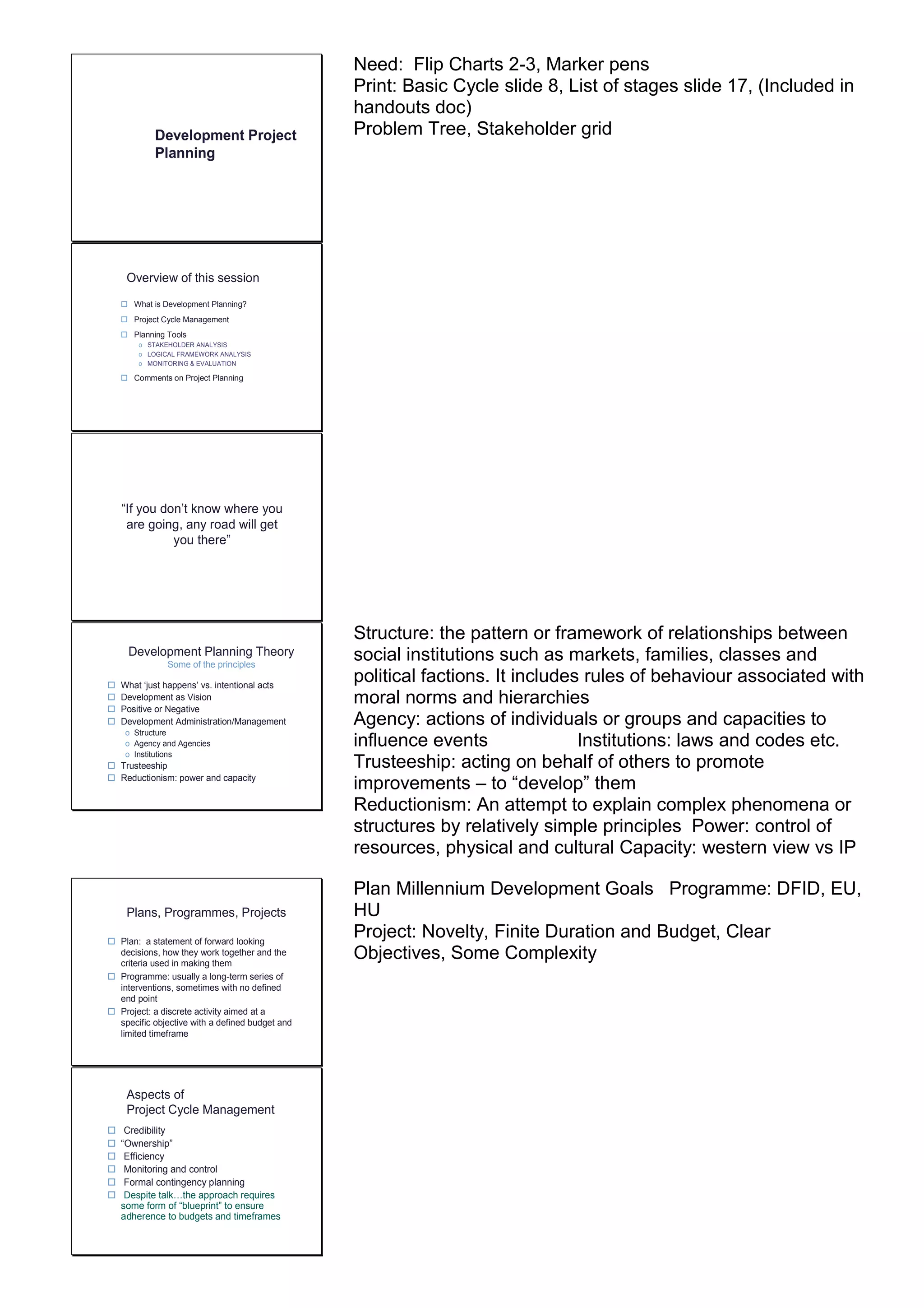This document provides an overview of development project planning and management. It discusses various planning tools like stakeholder analysis, logical framework analysis, and monitoring and evaluation. It also outlines the typical stages of a project cycle including identification, appraisal, implementation, monitoring, and evaluation. Key aspects at each stage like needs assessment, baseline studies, work plans, budgets, and lessons learned are reviewed. Limitations of the rational planning approach are also acknowledged.