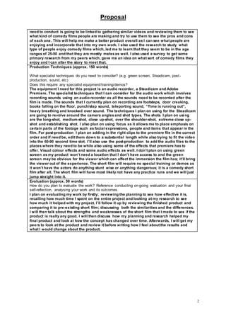 The document is a proposal for a comedy/sci-fi short film called "The Teleporter". It summarizes that the film will follow two guys who get their hands on a teleporting device and use it to play pranks but eventually get in over their head. It then outlines the target audience as being teenagers to adults, mainly appealing to males, from lower to upper social classes in the UK. It discusses the production techniques needed like audio recording and editing in Premiere. It provides a schedule for pre-production, production and evaluation over 3 weeks.