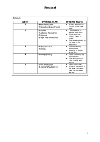 The document is a proposal for a short film called "The Stalker". It aims to target an audience of 15-25 year olds of both genders to attract a wider audience. The film will promote a sense of fear and unease in viewers before resolving into laughter. Over the course of studying film production techniques this year, the creator has learned the importance of planning and time management. The concept involves a stalker mysteriously handing food to two student victims. Research will be conducted on film techniques but none will involve using sources directly from the internet. Evaluation will involve discussing likes/dislikes of the final product and improvements for future films. A 5 week schedule is outlined with tasks including experiments, research, filming,