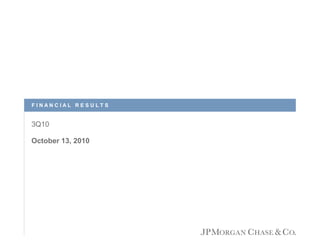 JPMorgan Chase reported third quarter 2010 net income of $4.4 billion and earnings per share of $1.01. Key business segments performed well, with the Investment Bank ranked #1 in global fees year-to-date, and Retail Financial Services reporting strong mortgage production. Credit costs declined from reductions to loan loss reserves. However, increases to litigation reserves reduced earnings. Overall, the company delivered solid results with improved credit performance.