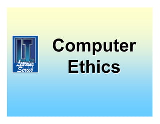 The document discusses computer ethics and outlines 10 commandments for ethical computer use. It defines computer ethics as good manners and proper conduct when using computers, such as not using them to harm others, steal, spread lies, or disrespect fellow computer users. The 10 commandments were created by Dr. Ramon Barquin and cover issues like software piracy, privacy, intellectual property, and considering the social impact of one's work.