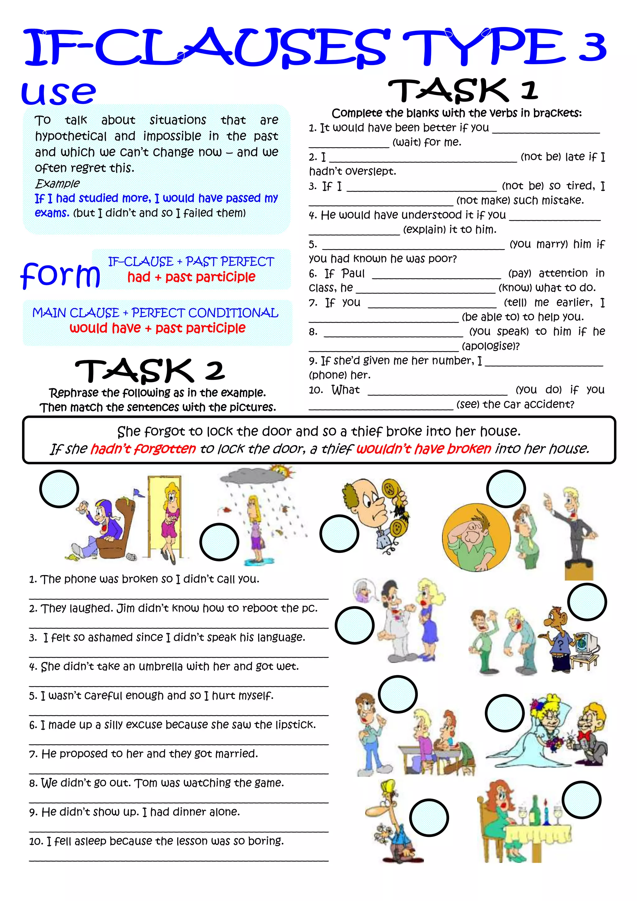 The document discusses hypothetical situations involving conditional sentences. It provides examples of sentences using the past perfect tense in the if-clause and would have + past participle in the main clause. The examples are about situations that cannot be changed, like failing an exam because one did not study enough. It then has students complete sentences with the correct verbs in brackets and match the completed sentences to pictures depicting different scenarios.