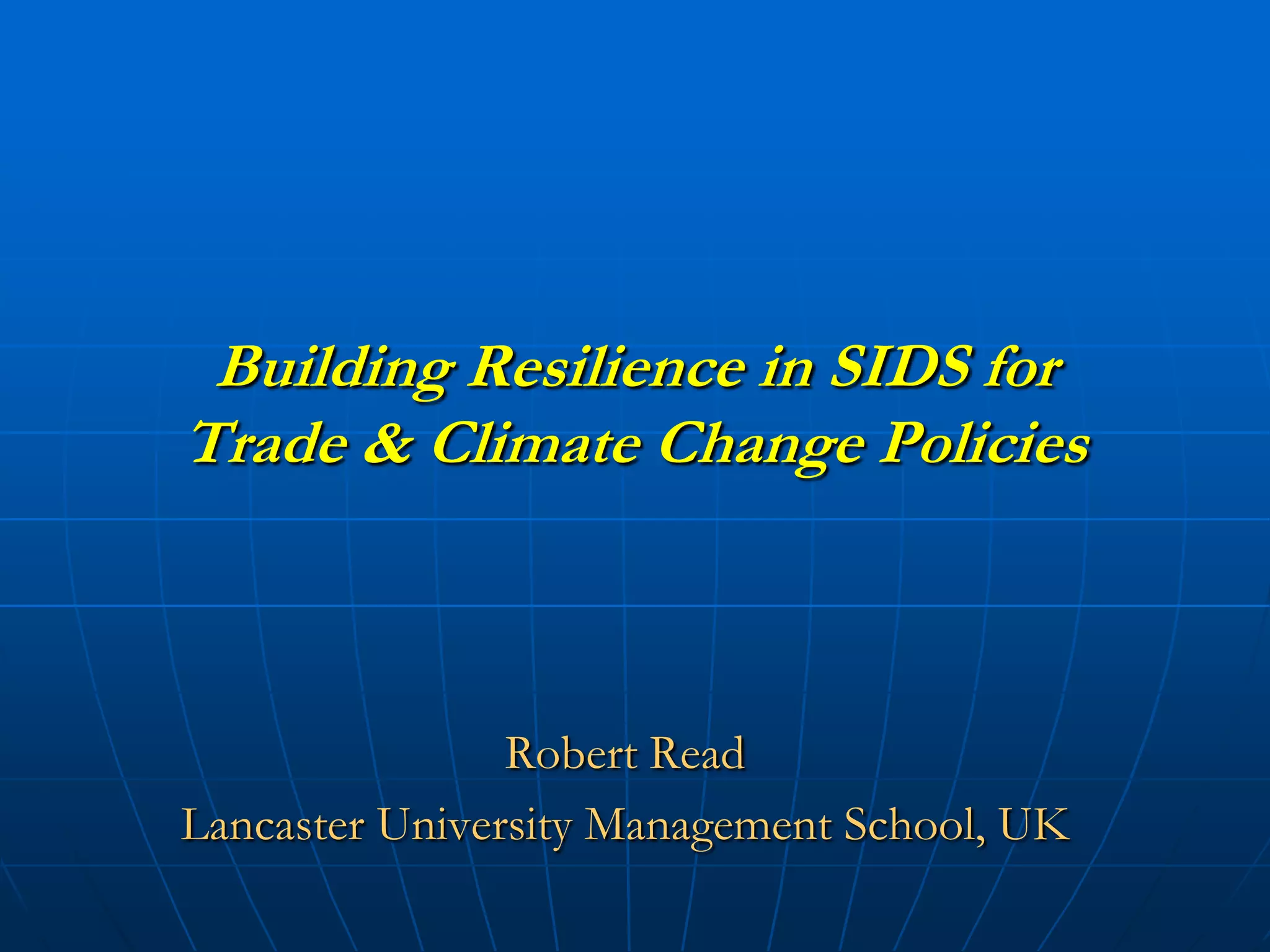 This document discusses key challenges facing small island developing economies (SILDEs) related to trade, climate change, and building resilience. It identifies that SILDEs have small populations and limited resources, making them highly open to trade but also vulnerable to external shocks. The document outlines policy options for SILDEs to enhance resilience, such as export and market diversification, improving infrastructure and technological capacity, strengthening domestic and foreign business linkages, investing in human capital, and ensuring good social and political institutions. The conclusion is that while SILDEs face significant challenges, many have achieved growth, and policies can help build resilience if properly implemented.