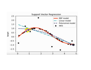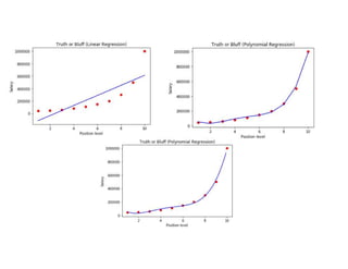 The document covers various regression techniques including simple linear regression, multiple linear regression, polynomial regression, support vector regression, decision tree regression, and random forest regression. It elaborates on the building of machine learning models, variable selection methods, and provides sample Python code for implementing multiple linear regression. Additionally, it includes details on evaluating regression models and interpreting coefficients.
