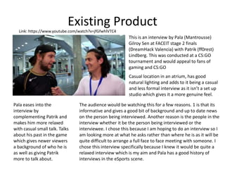 This document summarizes an interview between Pala Mantrousse and Patrik "ff0rest" Lindberg, a professional CS:GO player. The interview took place casually in an atrium at a CS:GO tournament. Pala eased into the interview with small talk to make ff0rest more comfortable before discussing his background in the game. The audience for this type of interview includes fans looking for player insights as well as background information on professional players. The relaxed nature of the interview allows ff0rest to openly discuss his career and plans for the future.