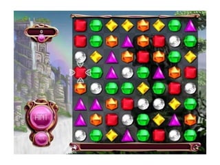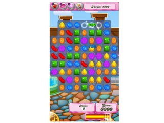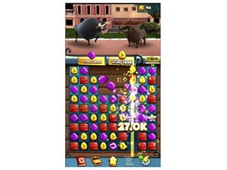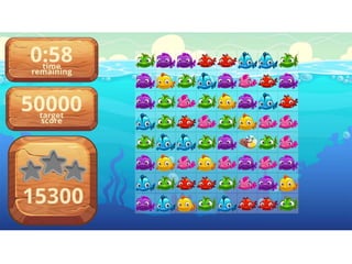 The document summarizes 4 existing matching games: Candy Crush, Bejeweled Blitz, Unstoppabull, and an unnamed underwater-themed game. It notes common features like using bright colors, backgrounds related to the theme, music/sounds, and challenges like timers or targets to make the games exciting. The analysis concludes the author will include bright colors, music/sounds, and a challenge in their own game to keep the audience engaged.