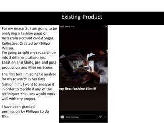 Freddie analyzed a fashion film by Philippa Wilson to inform their own fashion film project. They looked at location and shots, pre/post-production effects, and mise-en-scene. Freddie also conducted market research through a survey and interviews. The survey showed that location, music, and streetwear are important to the target audience. Interviews with Philippa and designer Rachel provided advice on staying inspired and the creative process. Freddie plans to incorporate key elements like relevant location, music, and streetwear style based on the research.