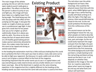 The document analyzes sample MMA magazine layouts and their visual styles, finding common features like bold text, red/black/white colors symbolizing blood in the sport, and images portraying fighters in mid-fight poses. After research, the author plans