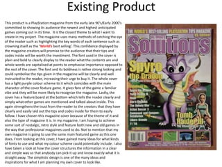 This document analyzes and summarizes several existing product designs that are relevant to the creator's magazine project. It discusses the common features found across the researched products, such as strong color schemes, layering for depth, and use of bold fonts. The creator notes they will take inspiration from the minimalist yet colorful website design and will include text wrapping in their own double page spread design. The research will help inform the creator's production work, particularly the magazine cover and website design aspects.