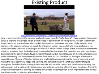 The document provides an analysis of existing music video products that will inform the creation of the author's own music video. It summarizes 4 music videos, noting common features like being narrative-based and featuring the artist lip syncing. It also summarizes the results of audience research surveys and interviews that reveal the target audience is mostly male ages 16-18 who prefer good visuals and editing over other elements. The document concludes that the author will incorporate one-take filming and creative editing styles in their video to appeal to this audience.