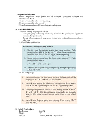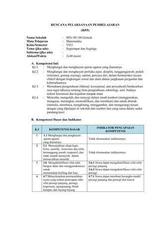 Rencana Pelaksanaan Pembelajaran (RPP) ini membahas tentang pembelajaran materi segiempat dan segitiga di kelas VII semester 1. RPP ini menjelaskan kompetensi inti, kompetensi dasar, indikator, tujuan pembelajaran, materi, metode, media, langkah-langkah pembelajaran, dan penilaian hasil belajar siswa.