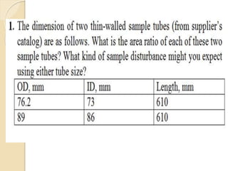 This document discusses soil sampling and exploration. It describes different types of soil samples including disturbed, undisturbed, representative and non-representative samples. It discusses criteria for obtaining undisturbed samples and transporting and preserving samples. Different types of soil samplers are described. Factors related to planning a soil exploration program such as spacing and depth of borings are covered. Components of a soil exploration report are outlined.