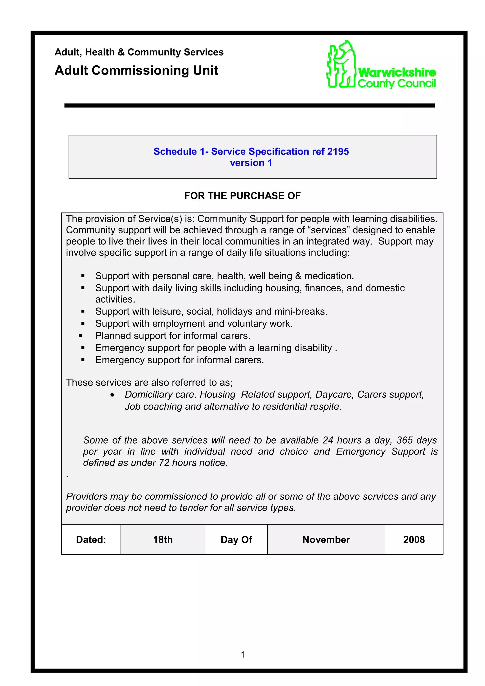 This document provides a service specification for community support services for people with learning disabilities. The specification outlines the types of support to be provided, including personal care, daily living skills support, leisure activities, employment support, and emergency support. It describes the intended outcomes of the services, such as increased independence, community participation, and choice and control for service users. Key performance indicators are identified for measuring outcomes related to areas like exercising choice and control, health and wellbeing, and personal dignity. The specification is intended to guide providers in delivering services that meet the needs and achieve the goals outlined.