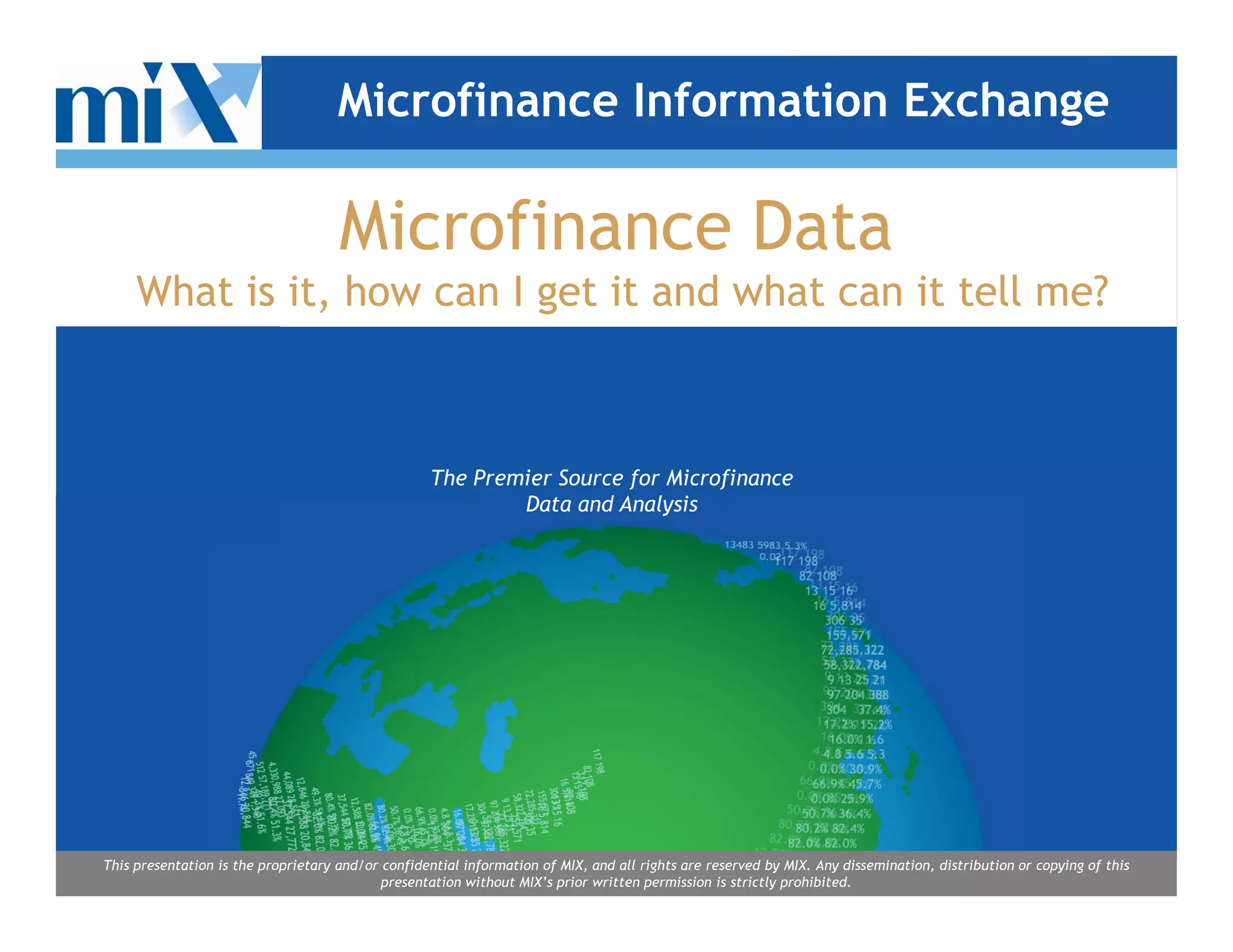 The document discusses microfinance data and its sources. Microfinance serves over 140 million poor clients globally through business investments and basic needs loans. Microfinance data comes from internal financial institution systems and external reporting, though it can be difficult to obtain. Aggregate microfinance data helps understand industry trends and identify supply and demand gaps. Risk indicators and outside data provide context to interpret credit growth and savings trends. The Microfinance Information Exchange is a nonprofit that partners with industry leaders to collect, analyze and disseminate microfinance data.