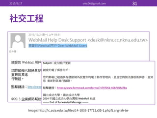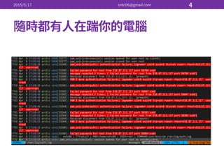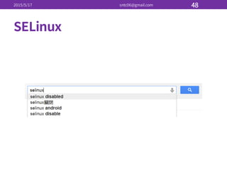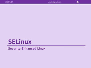 This document provides instructions on configuring Linux security features such as SSH key-based authentication, firewall rules using iptables, SELinux concepts, and the Fail2ban utility. It discusses generating SSH keys, editing SSH configuration files, setting default firewall policies and rules for input, output, and forwarding, as well as network address translation rules. It also covers SELinux file and process context types and restoring default contexts. Lastly, it explains how to install, configure, and check the status of Fail2ban to automatically ban IPs with too many failed login attempts.