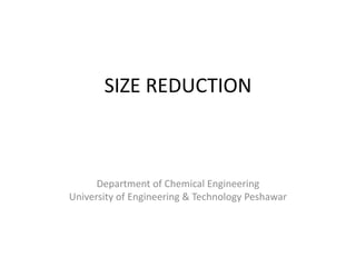 The document discusses size reduction, which is the process of reducing the size of solid materials through mechanisms like impact, attrition, compression, and cutting. Size reduction is important to increase surface area for applications like reactions. Common size reduction equipment includes crushers, grinders, and cutting machines. Crushers are used for coarse size reduction through impacts. Grinders provide intermediate and fine size reduction through impacts or abrasion. Factors that influence equipment choice include the feed and desired product sizes, material properties, and capacity needs. The efficiency of size reduction depends on factors like the energy required to generate new surface area.