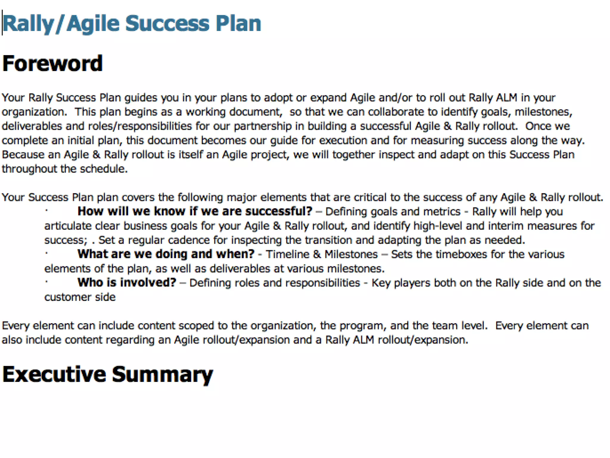 The document outlines 3 steps to a successful Agile rollout: 1) Direct the Rider by motivating people using concrete examples and celebrating small wins, 2) Motivate the Elephant by addressing fears and building new habits, and 3) Shape the Path by establishing an environment that supports the new process. It provides tips for each step such as grooming backlogs, using standup meetings, and publicizing successes. The overall goal is a smooth transition to Agile working by addressing both rational and emotional aspects of change.