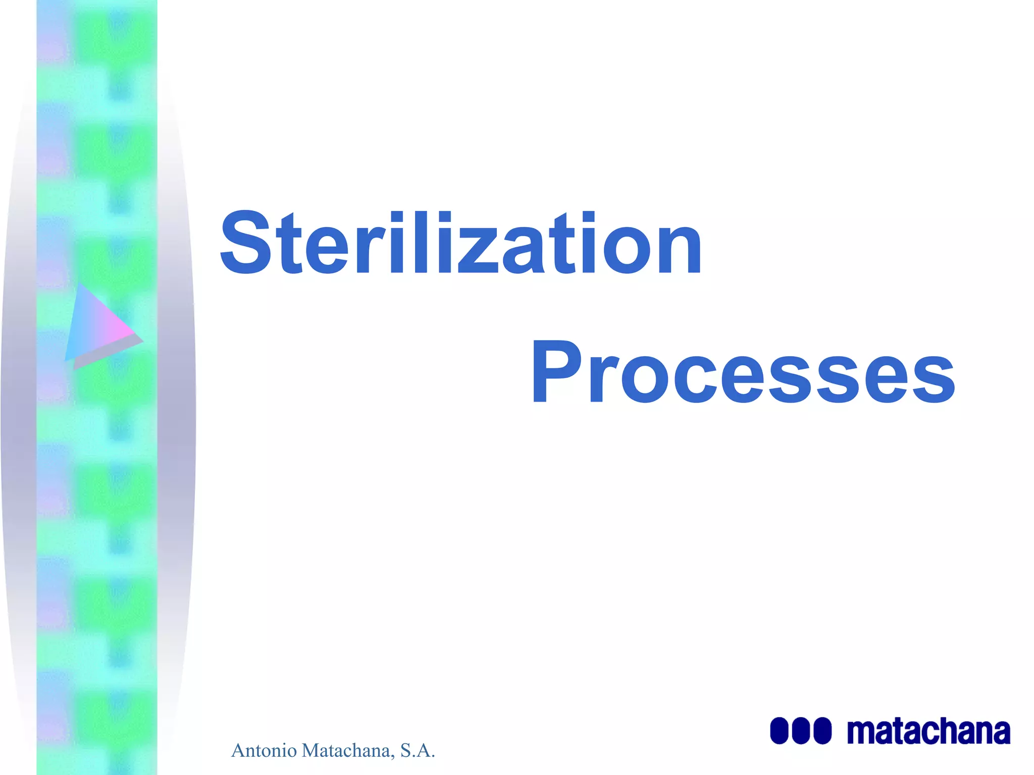 The document discusses sterilization processes. It describes sterilization as the process of destroying all life forms from an object or medium. There are several sterilization methods including heat, radiation, gases, and liquids. Effective sterilization requires proper pre-sterilization preparation, use of the correct sterilization method for the materials, validation of the sterilization process, and maintenance of sterile conditions during storage, packaging, and use.