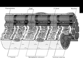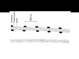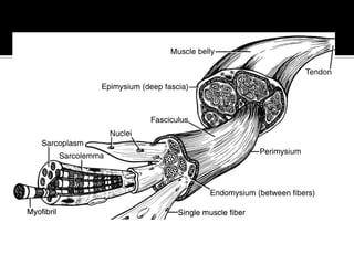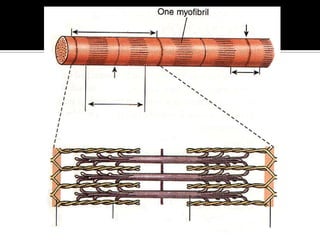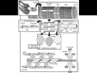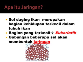Dokumen ini membahas struktur sel daging ikan yang terdiri dari berbagai komponen seperti miofibril, miofilamen, dan sel-sel jenis lainnya yang memiliki fungsi spesifik dalam tubuh ikan. Sel daging ikan berperan dalam kontraksi otot dan mengandung protein penting seperti aktin dan miosin yang saling berinteraksi selama proses kontraksi. Terdapat juga penjelasan mengenai lapisan-lapisan jaringan ikat yang menyusun otot dan peran berbagai sel dalam mendukung fungsi jaringan otot.